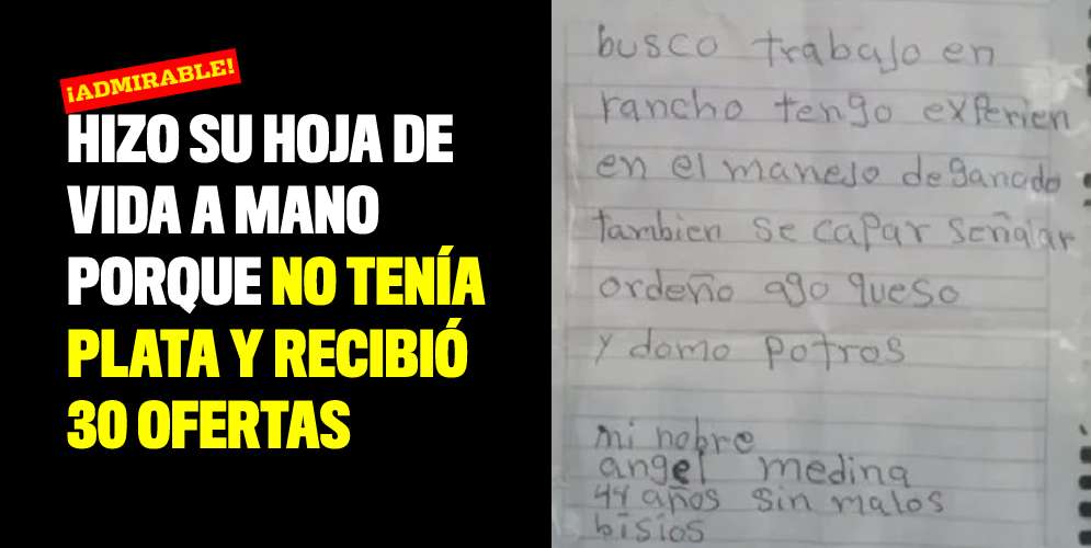 La historia de Ángel Medina se hizo viral en redes sociales, pues él con muchas ganas de trabajar y al no tener plata, hizo su hoja de vida a mano y la pegó en postes.
