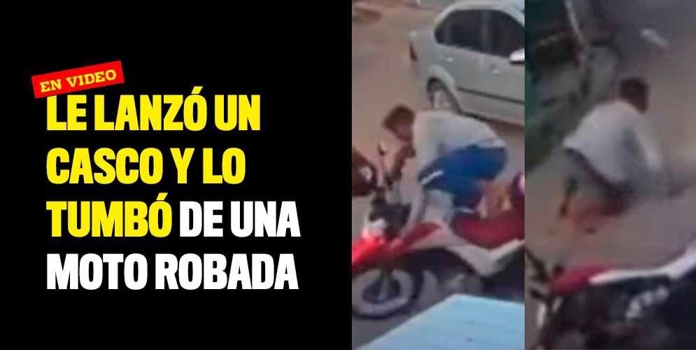 Un delincuente que ya estaba listo para emprender la huida en la moto robada, nunca pensó que un hombre le iba a lanzar un casco, con tan buena puntería que le pegó en la cara y lo tumbó.
