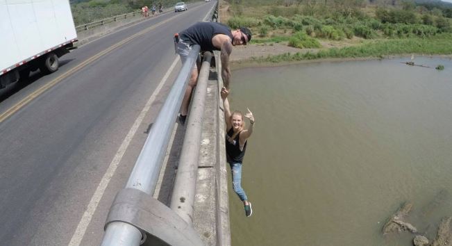 Se trató de McKenna Knipe. La mujer oriunda de EE.UU fue de visita a Costa Rica y decidió tomarse esta arriesgada foto en la localidad de Jacó. En dicho lugar es famoso este afluente por la cantidad de cocodrilos que viven en el, pero poco le importó a McKenna, que sin pensarlo dos veces se colgó desde el puente para su foto.